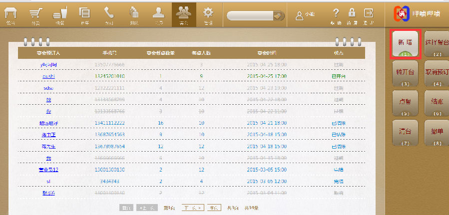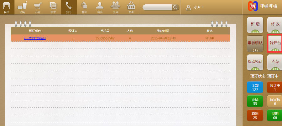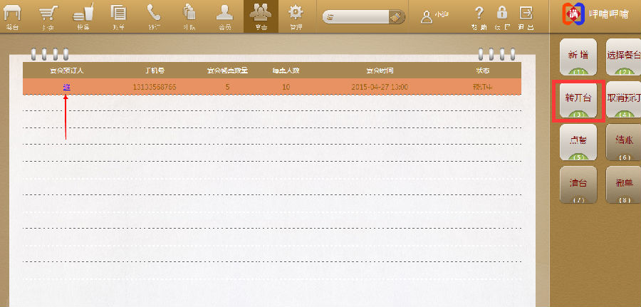 步骤三:点击预定好的客人信息,再点击【转开台】
