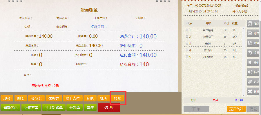 步骤一:在堂点账单界面,点击挂账,进入会员卡挂账界面。