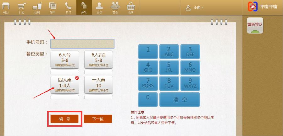 步骤二:在排队界面,输入顾客的手机号,选择用餐人数,点击领号。