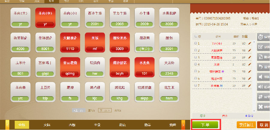 步骤一:点击餐台,再点击右面的【点菜】即可点自己想吃的菜了,点好后点击下面【下单】
