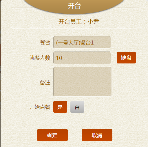 步骤二:点开台后,可以输入备注,点击是否开始点餐后,点击【确定】开台。
