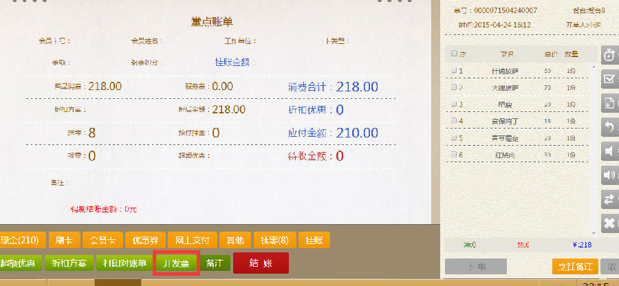 步骤四:在堂点账单界面,选择打印对账单或发票,点击结账。