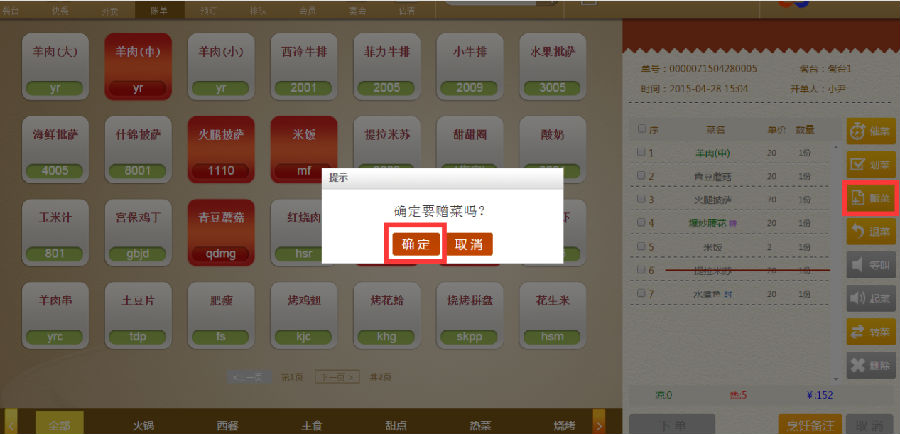 步骤一:点击需要赠送的菜品,再点击右面的【增菜】,提示点击【确定】即可。