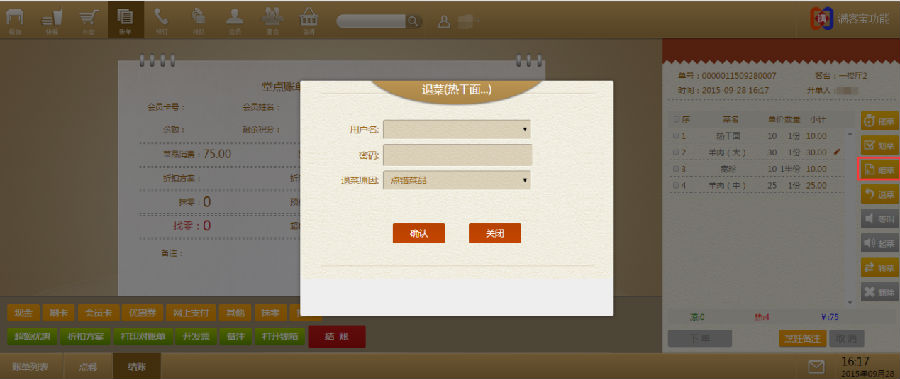 注:没有退菜权限的服务员,进行退菜时,需要让有退菜权限的人员协助输入用户名及登陆密码,并选择退菜原