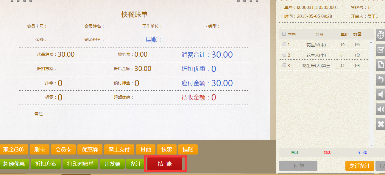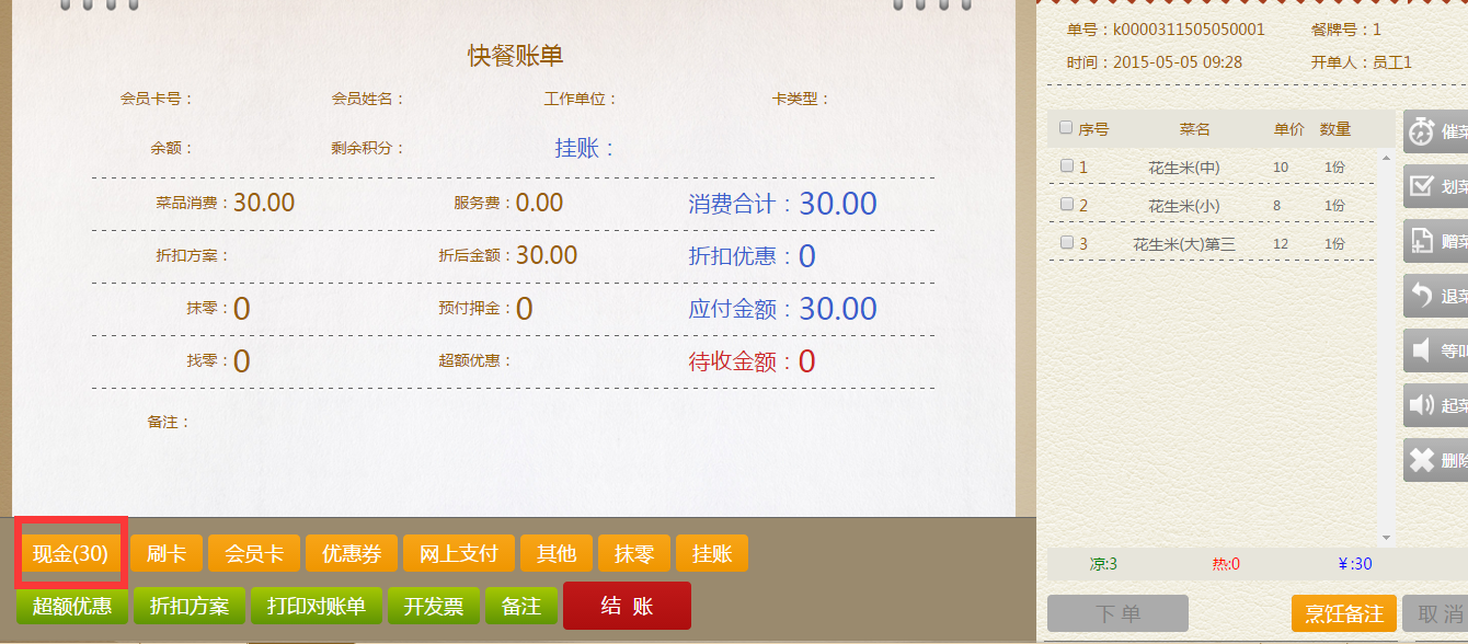 步骤一:完成点菜下单,直接进入结账界面,在结账界面选择你的结账方式,如:现金结账,点击现金,界面弹出消费金额,点击确定,回到账单界面。