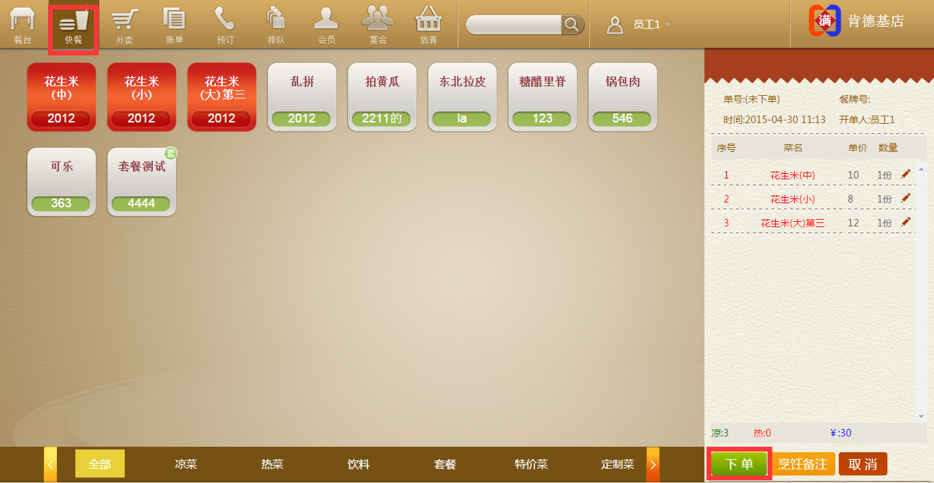 步骤一:点击快餐,进入点菜界面,在点菜界面选择您需要的菜品,点击下单。