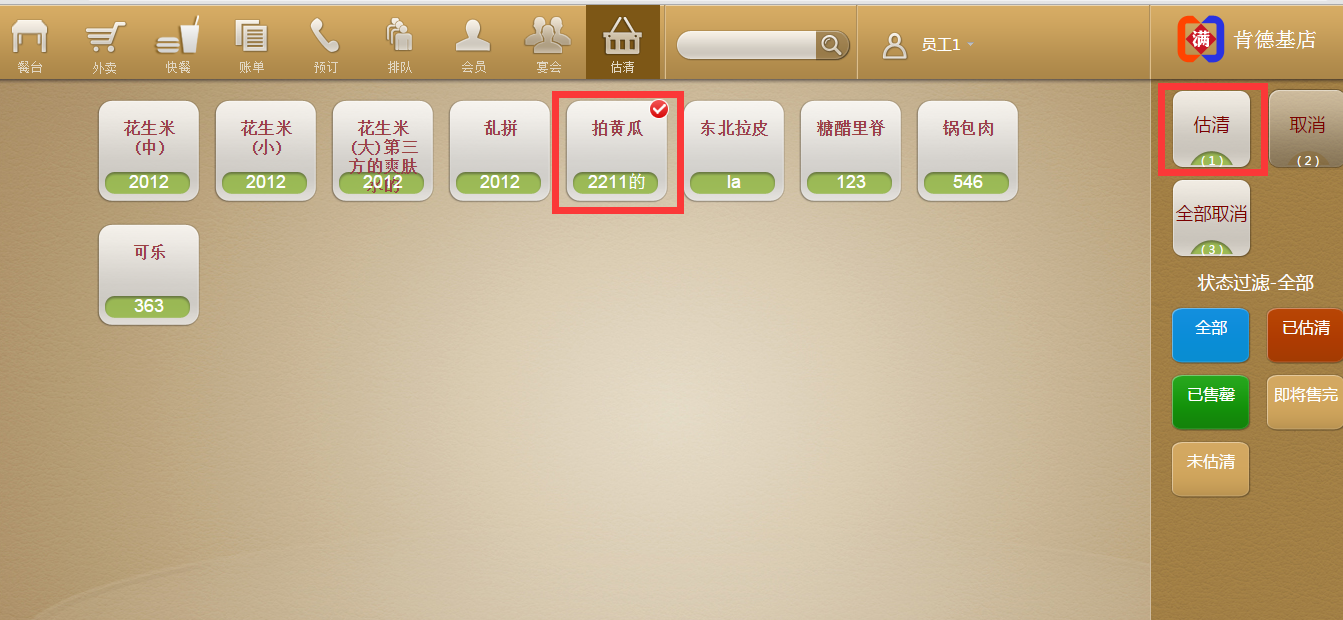 步骤一:在系统默认界面,点击估清,进入估清界面,选中估清的菜品,点击右上角估清,输入估清菜品数量,点击确定。