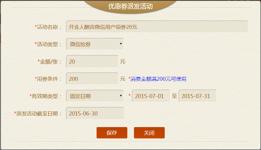 活动类型选择“微信抢券”,填写优惠券金额、用券条件、有效期、活动截至日期后保存活动。