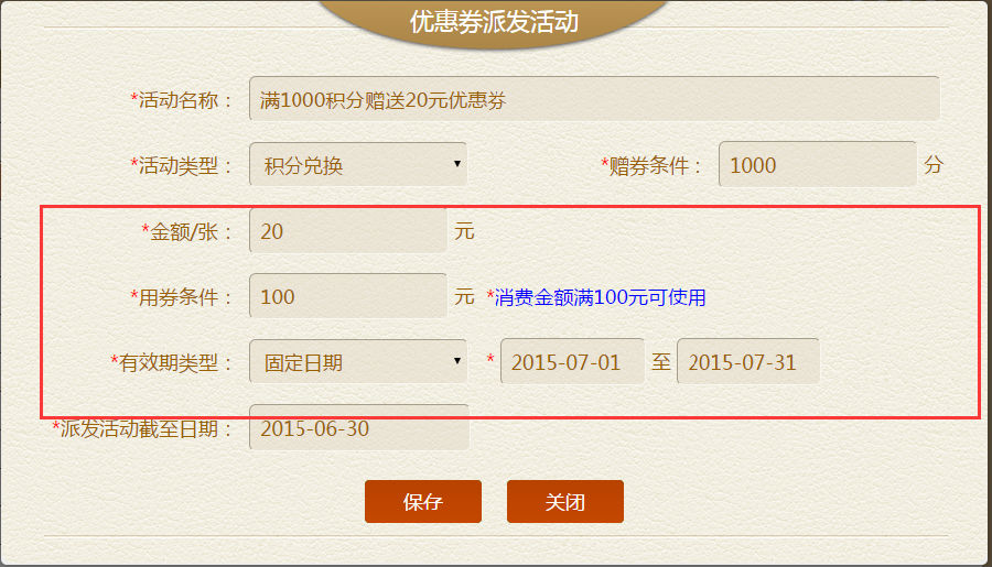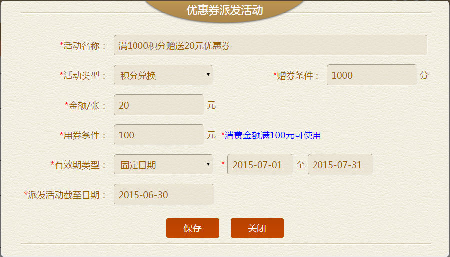 如下图:创建了一个满1000积分兑换20元优惠券的活动,该优惠券需要消费满100元方可使用。