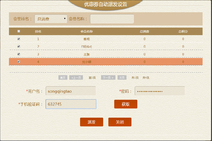 选择要派发优惠券的目标会员,填写当前登陆人的用户名密码及商家老板的手机验证码,点击“派发”。系统将会向勾选会员派发当前商家的优惠券,优惠券信息来源于手动派发选择的优惠活动中的:金额/张、用券条件、有效期。