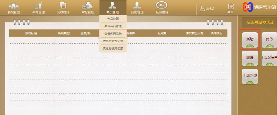1.1.1 登录满客宝,“进入后台”,点击进入“微信优惠活动”,点击新增,如下图示: