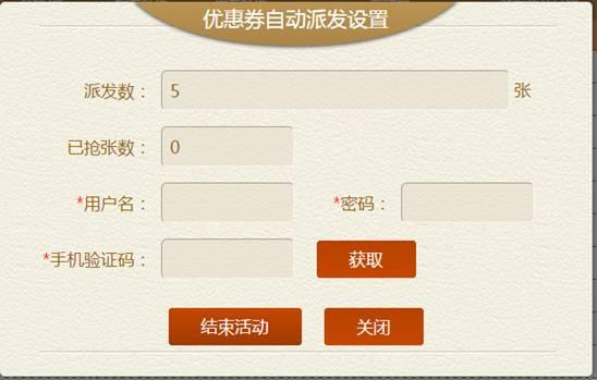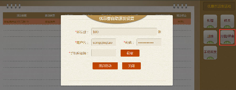 填入优惠券派发张数。为了安全起见,此处需要输入当前登陆人的用户名密码及商家老板的手机验证码。点击开启活动后,满客宝后台会根据该餐厅的每一笔微信用户的网上支付记录的支付金额,满足派发条件的自动派发优惠券。