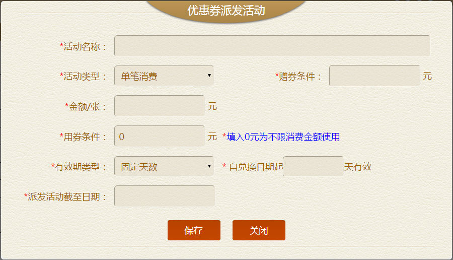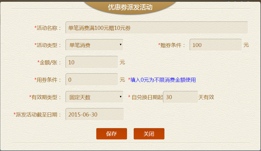 用券条件是指消费金额满多少元可使用此类优惠券,如果填写0,则不限消费金额使用。