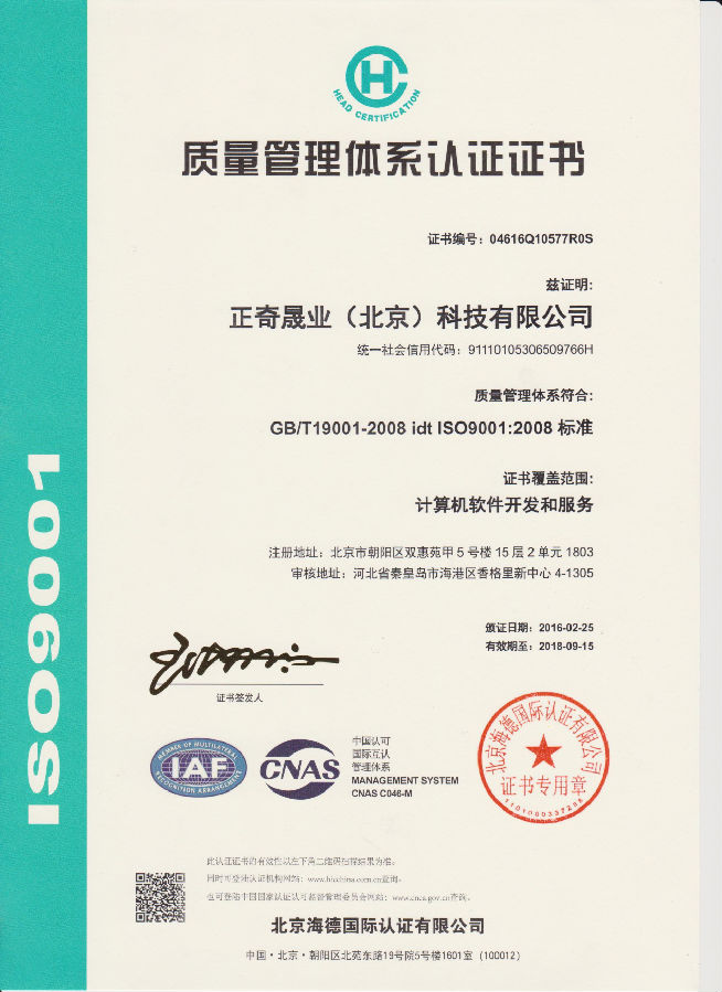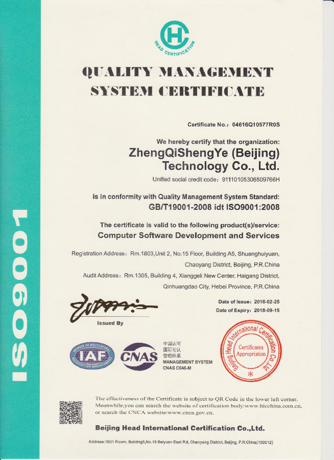 ISO9001:2008质量管理体系认证证书的取得,是公司各项管理工作的规范化、标准化的全面检测,是对正奇晟业(北京)科技有限公司持续稳定健康发展的重要保证。我们将进一步优化和规范各项管理制度,不断提高体系运行的有效性,不断提高公司的管理水平,共同推进公司的快速发展。