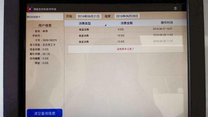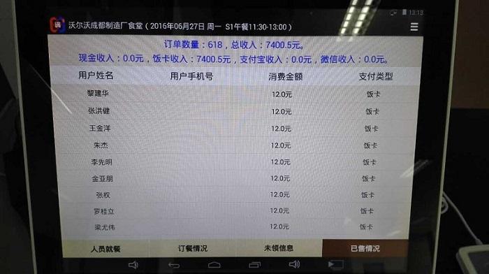 沃尔沃员工就餐时,通过满客宝智能售饭终端可快速查询饭卡信息,包括姓名、卡号、现金余额、餐补余额等。