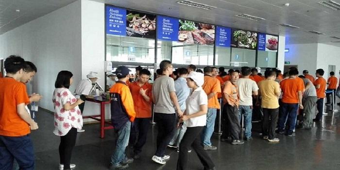 沃尔沃成都工厂于2016年6月顺利实施应用满客宝智慧食堂,图为就餐高峰时段沃尔沃员工整齐有序地排队取餐。