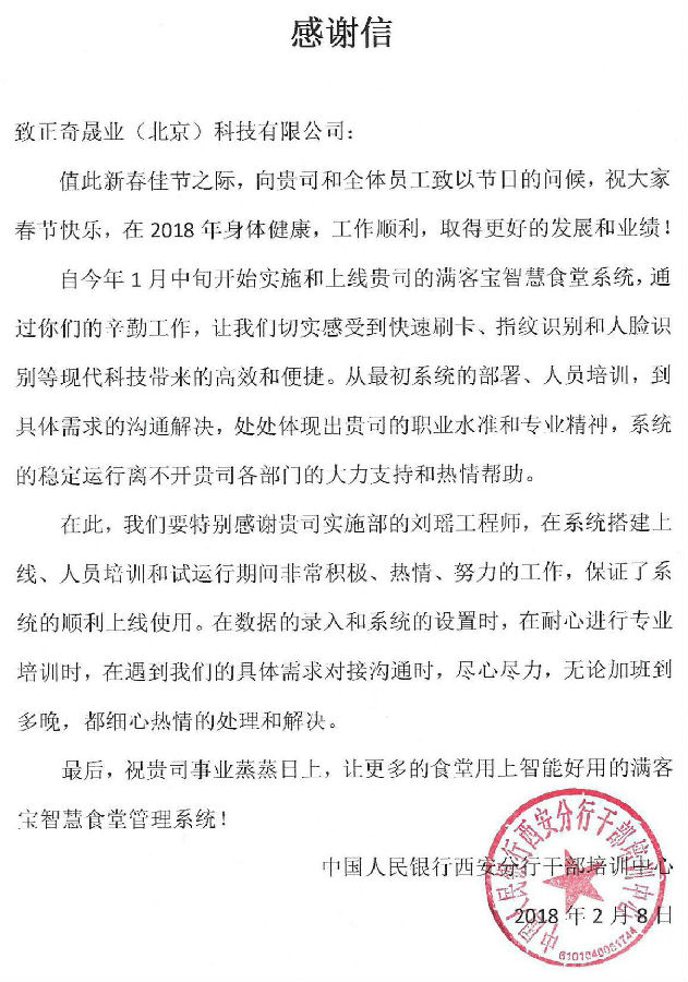 新年伊始,越来越多项目上线,“满客宝”好口碑又一次被充分认可!中国人民银行西安分发来感谢信,感谢满客宝智慧食堂系统工程师刘瑶的认真负责和踏实勤奋,同时肯定了满客宝智慧食堂项目组各部门的大力支持和热情帮助。