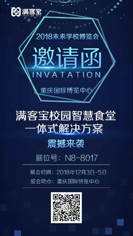 2018年12月3日-5日,正奇晟业诚挚邀请并热烈欢迎全国各地教育界同仁、各教育技术装备生产经营企业和社会各界朋友莅临“2018未来学校博览会”!满客宝将与在座各位一起,不忘初心、砥砺前行,推动校园餐饮全面升级。
