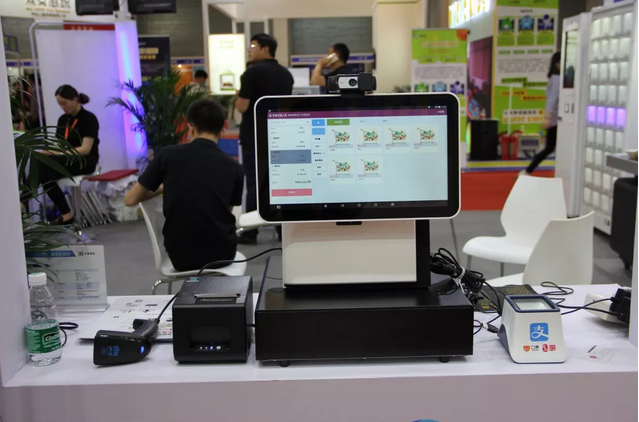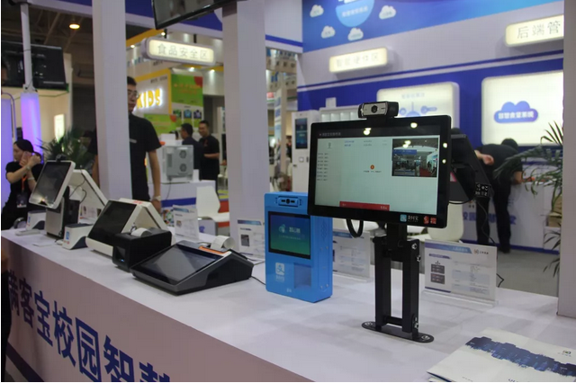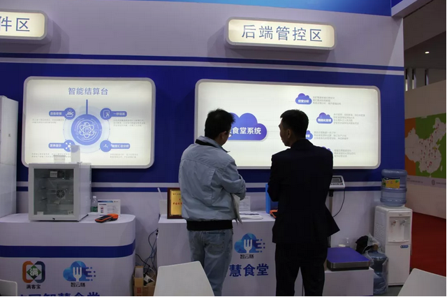 展会中分为六个展区:刷脸就餐区、扫码结算区、超市结算区、后端管控区、食品安全区、智慧硬件区。
