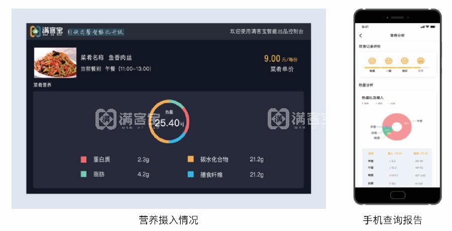 在建设营养健康食堂方面,满客宝智慧食堂推出营养卫士功能,搭配智能化设备可分为三部分,即菜品营养信息显示、每餐营养分析和健康饮食建议,满客宝智慧食堂科学应用分析健康大数据,将食堂每个菜品的营养信息通过智能显示屏展示;就餐完成后,根据用户上传的身体情况和订单信息精准计算用户营养摄入情况,并提示用户进行膳食摄入结构调整和个性化的饮食营养、运动建议,实现科学营养就餐,为用户健康保驾护航。