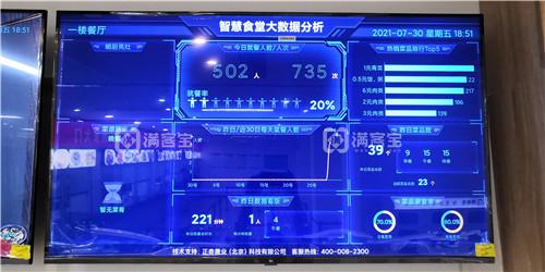 从就餐方面来说,满客宝将智慧食堂管理系统与前端食堂智能设备进行联动,整理、储存、分析消费数据、支付数据及用户账户数据,生成每日就餐数据、菜品数据分析、就餐人数统计、用餐满意度等,并将其以数据可视化形式,展现在食堂数据大屏上。