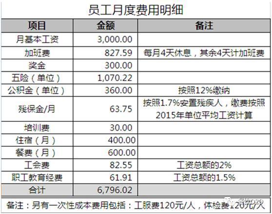 以一名月基本工资为3000元的基层员工为例,如下,是餐饮企业需要负担的一个月的人力成本: