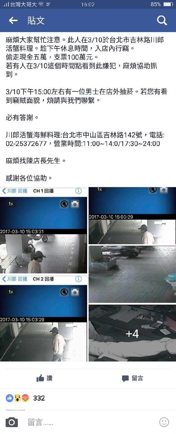 台北市吉林路「川郎活蟹」帝王蟹海鲜餐厅,本月10日传出重大窃案。年约40多岁的中年男子,趁餐厅午休,店门半掩方便厂商送货时机,从容闯入店内,见四下无人,撬开柜台抽屉,偷走现金5万元与100万元要给厂商货款的支票,店内人员事后发现报警,但嚣张贼已逃逸无踪。