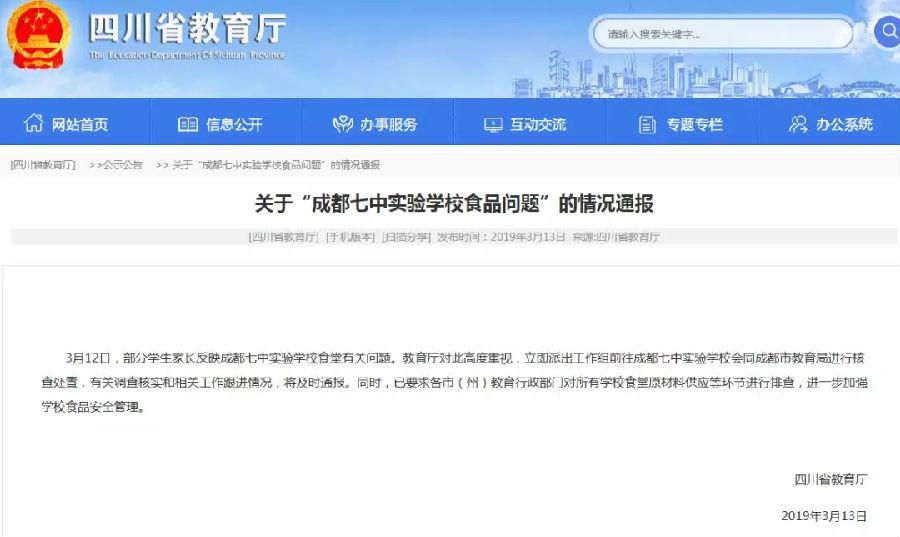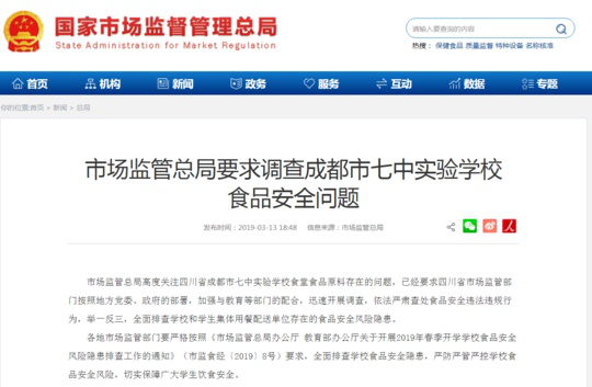 市场监管总局要求调查成都市七中实验学校食品安全问题 全面排查校园食品安全风险