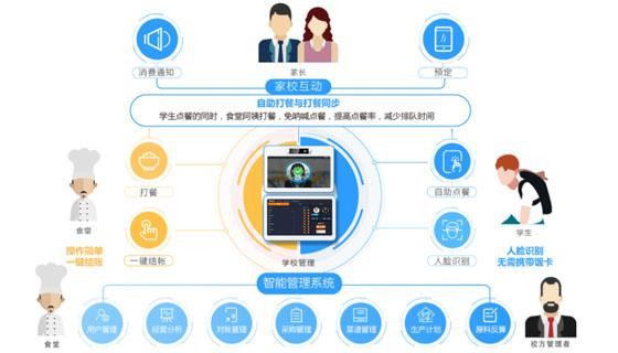食堂内每个窗口都装有一台带有人脸识别功能的“刷脸器”,每台机器装有摄像头,可以触屏操作,外表和普通平板电脑极为相似。学生站在智能食堂人脸识别设备前不到1秒钟,身份就会被识别出来,姓名、套餐类型等就餐信息便出现在屏幕上,学生确认信息无误后,点击“确认”即可完成支付,整个过程花费时间不超过5秒钟。在孩子每完成一笔“刷脸”消费后,家长的小程序都会实时收到账单,很直观的了解到孩子的就餐详情、营生摄取情况和账户金额的去向。