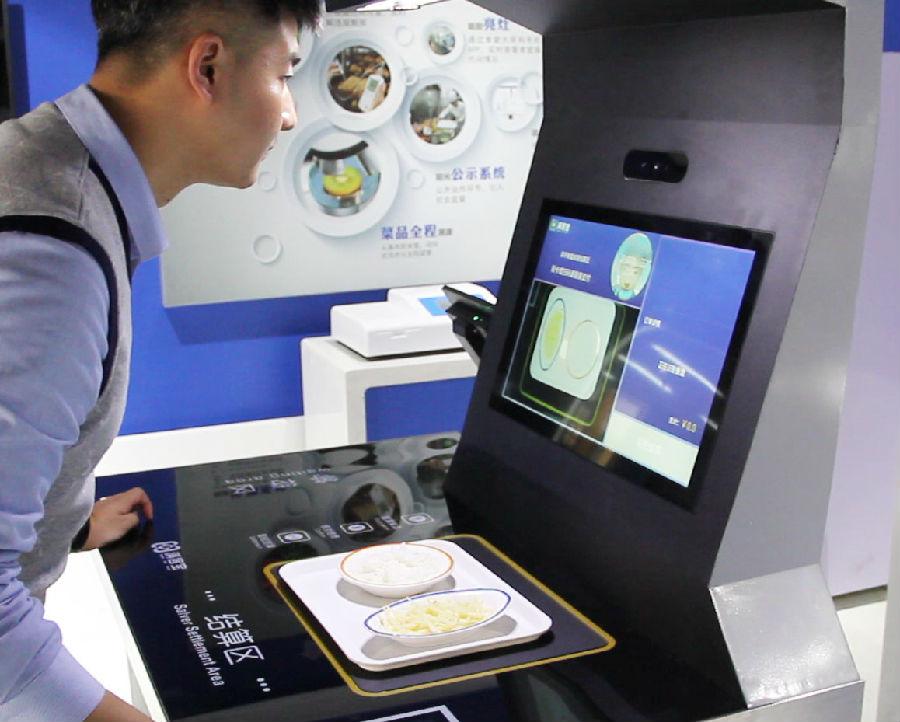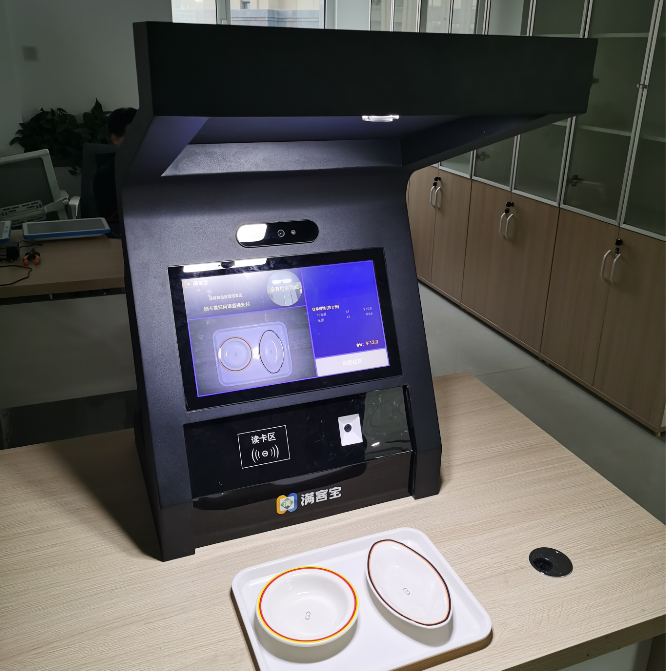视觉识别结算台,利用图像识别技术,实现自助快速结算。只需将餐盘放于结算台上,通过AI视觉识别技术识别餐盘或菜肴,系统将自动完成价格计算,并将消费金额传输到支付终端。