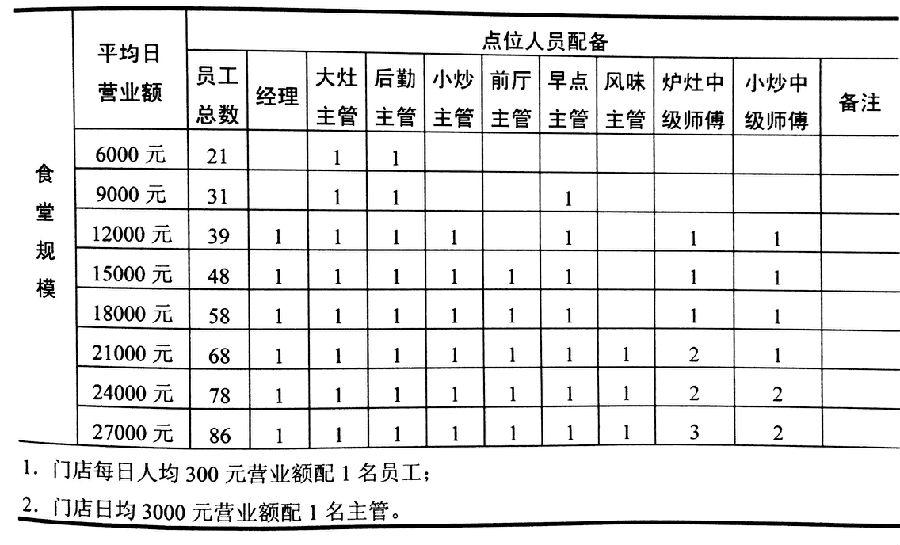 比率分析法是通过计算某一商业要素与员工数量的比率数,推测企业需要员工的数量,它比趋势分析更加精确。商业要素与劳动力数量的比率通常是由某个行业的生产率决定的。现以中快餐饮集团的食堂人员配备为参考,见下表。