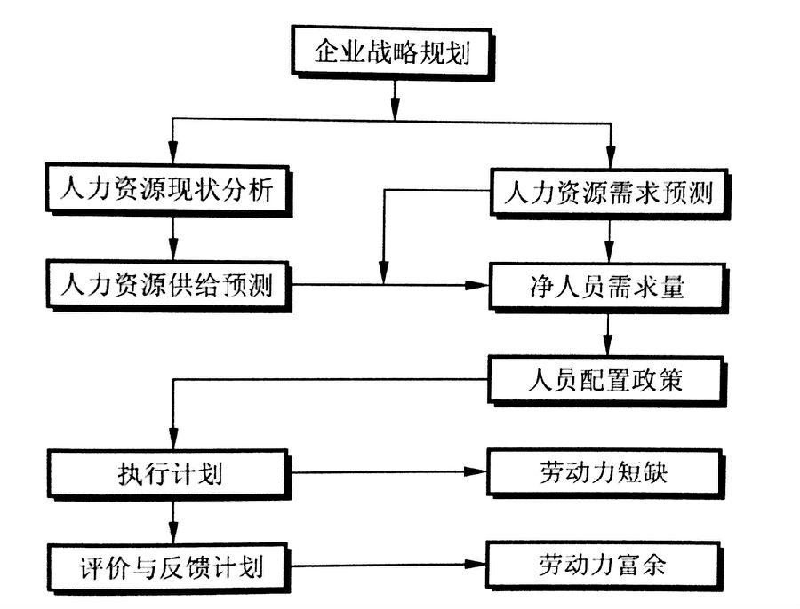 人力资源规划是一个系统的程序,包括明确企业发展战略与目标、分析企业人力资源现状、预测人员需求、预测人员供给、制订行动方案、控制与评价六个阶段,其中预测人员需求、预测人员供给和平衡是企业人力资源供需规划的
