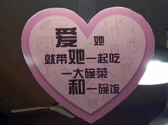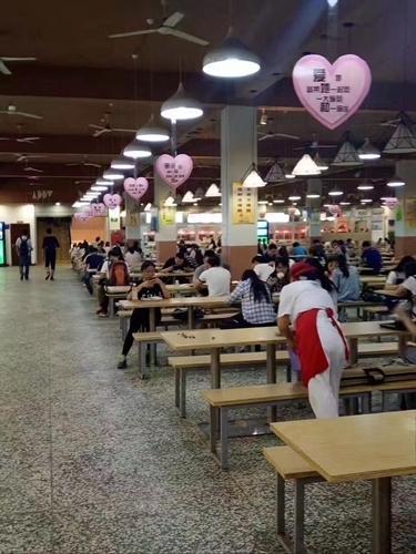 这些悬挂在食堂顶部的粉色心形吊牌,为5.20营造出了不一样的氛围。有同学感叹:“好浪漫啊,很喜欢和男朋友呆在这种环境下。”但有单身的同学称“太虐心了”。