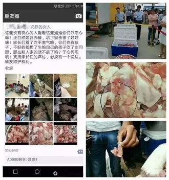 近日,贵州省黔西南州安龙县部分学生家长在校门口拦下某集团配送食材车辆,截获该集团为学校配送的肉类,发现配送的肉有变质、生蛆、发霉、恶臭等情况。而学校的孩子们长期食用配送的肉类,家长们对此异常气愤,随后将“问题猪肉”在微信朋友圈曝光传播。