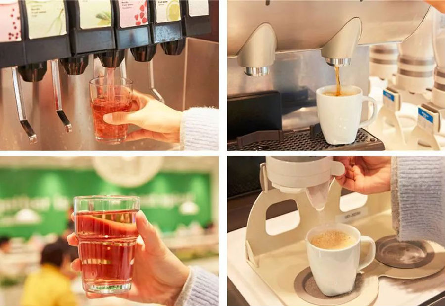 所有的茶饮区都是免费提供的,如果觉得咖啡苦的话可以使用自动加糖机。而软饮区的种类比较多,蔓越莓汁、绿茶等等