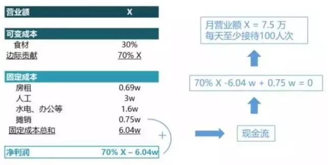 成本可以分为固定成本和可变成本,可变成本主要是食材成本(假设30%),固定成本是你每个月必须支出的费用,包括房租(0.69w)+人工(3w)+水电、办公等(1.6w)+摊销(0.75w)=6.04万