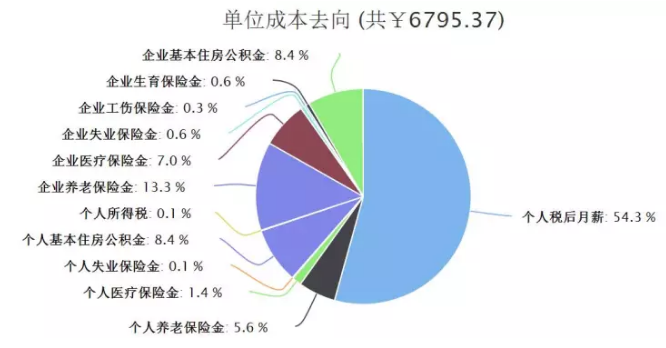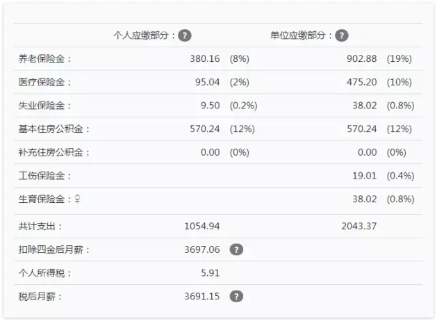 从这个图中可以看出,缴纳五险一金,不仅员工的工资会在原有的基础上少1054.94元,单位还需要额外支付成本2043.37元。