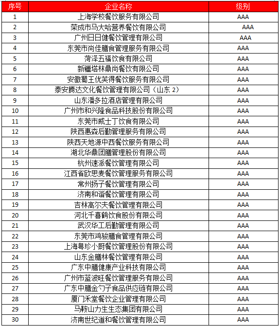 【独家整理】全国餐饮行业企业信用等级评价(首批团餐企业)