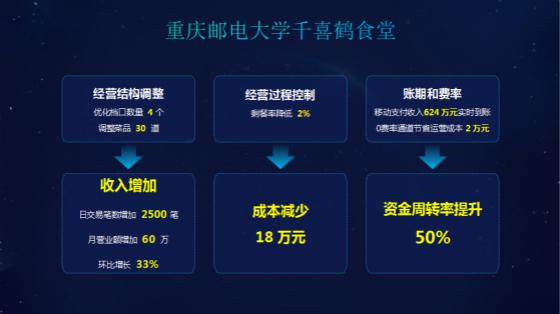 重庆邮电大学在校学生2.4万人,在校职工1600余人,共有9个食堂,互相竞争。而千喜鹤食堂日就餐超过9000人次,共有18个档口,100个餐桌,400个座位。经营中面临的主要问题是,竞争激烈、就餐效率低、结算账期长、数据获取困难,无法精准备餐等。通过经营结构的调整,经营过程的控制、移动支付方式的渗透,千喜鹤食堂通过满客宝智慧食堂软件实现日交易笔数增加2500笔,月营业额增加60万,环比增长33%;成本减少18万元、资金周转率提升50%。无疑,这一数据告诉我们,团餐信息化带来的价值非常显著。
