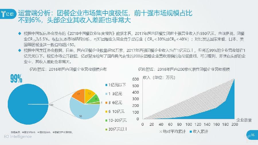 进一步,根据中国烹饪协会数据,目前,国内团餐企业数量超10万家,2017年百强团餐企业收入均在1亿元以上,但将近99%的企业营收都在1亿元元以下。根据市场公开数据,亿欧智库绘制了国内具代表性的200家团餐企业营收规模的洛伦兹曲线,可以看到,即使在头部的企业中,其收入差距也非常大。