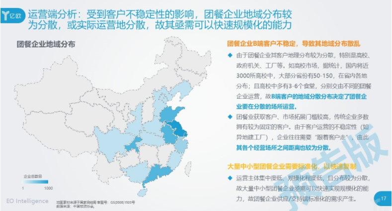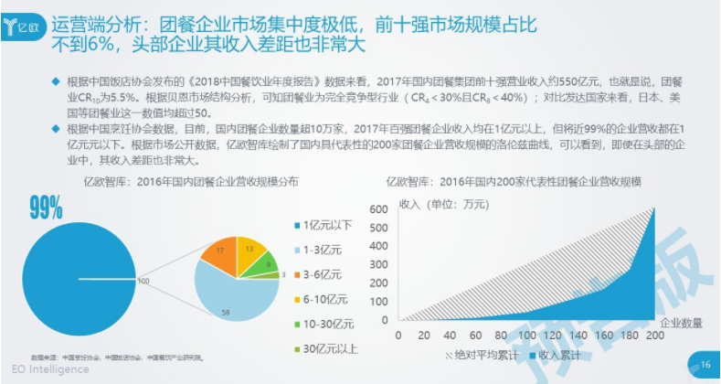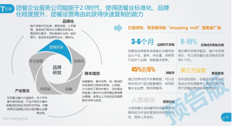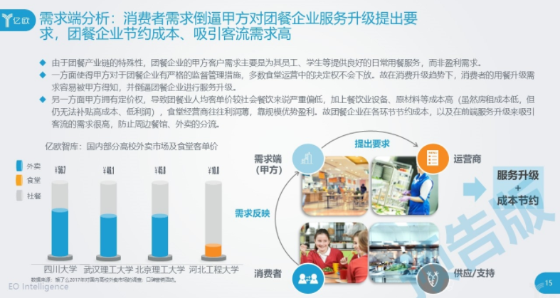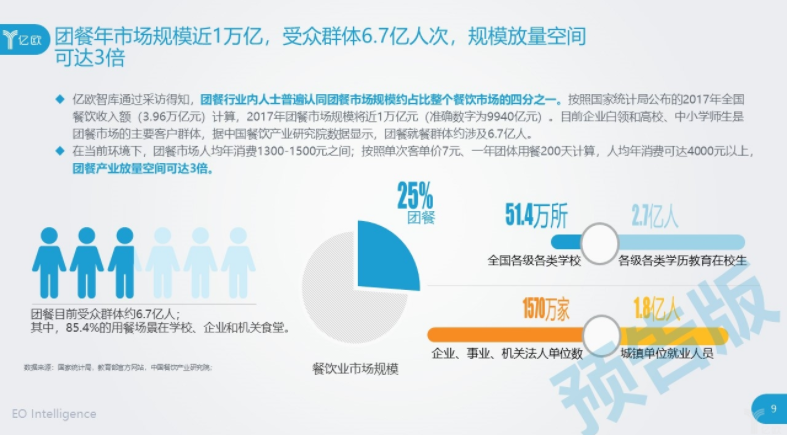 首先,团餐在整个餐饮行业中有四分之一的市场,也就是近一万亿的规模、4-6亿的用户规模。但用户的消费单价较低,故而拥有着巨大空间。亿欧智库初步测算,团餐业放量空间可达3倍。