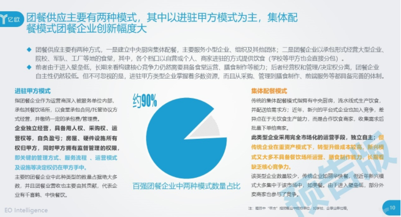 从团餐企业的经营模式看,进驻甲方占绝对大头,有将近9成,集体配餐占比1成。从当前创新幅度看,集体配餐类型显然创新幅度更大、速度更快;但相比于集体配餐市场,进驻甲方市场更有空间,也更有难度和挑战。