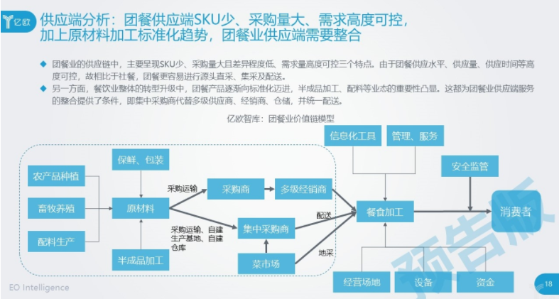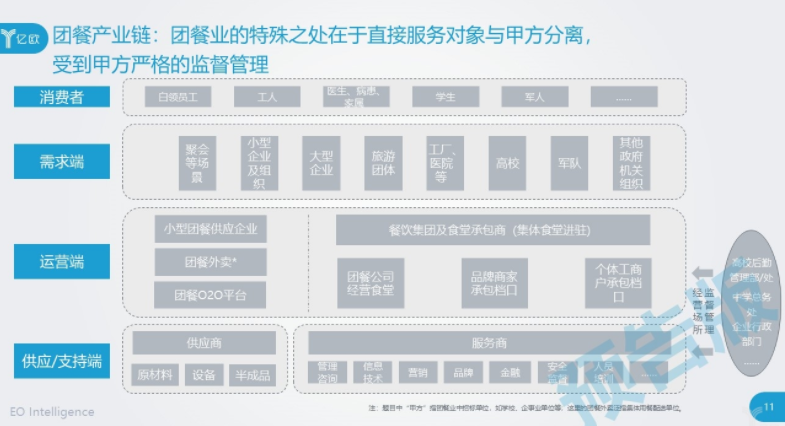 在报告中,我们勾画了团餐产业链的结构图。产业链条三个部分各有特点各有问题。在需求端,消费者习惯养成,甲方倒逼运营方服务升级,同时,运营方成本优化、管理优化的需求巨大;在运营端,团餐行业集中度低、高度分散,CR10仅有5.5%;在供应端,团餐供应链可以高度整合,减少中间层层分销商,这不仅会大幅提高整体效率,而且可以大大降低团餐运营商的成本。