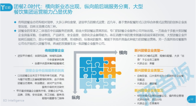基于行业这些特点和现状,我们认为团餐的2.0时代正在发生也必须发生也一定会发生。在报告中,我们把这个变化简单总结为横向新业态、纵向前后端服务分离,以及大型餐饮集团运营能力得到彰显。