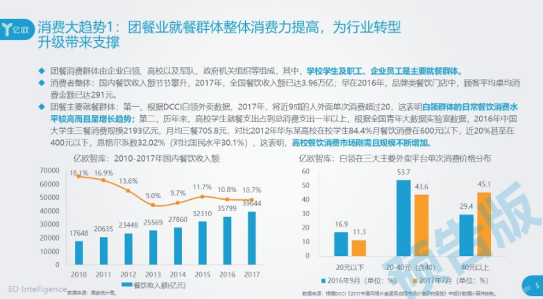 第一,新消费理念。首先,中国经济快速增长,居民的可支配收入、消费能力也快速增强,我们能看到仅仅餐饮行业过去8年,收入额从1.7万亿上涨到3.9万亿。同时消费的客单价,仅仅拿外卖举例,也是不断走高。同时,消费升级这个说法确实已经深入人心,这里面包含消费者对消费场景、消费体验、消费服务等方面更高的要求;社会餐饮、实体零售过去几年已经做出了比较明显的一些变化。某种意义上,这一点在倒逼团餐服务的变革。我们相信即使不作为产业从业者,作为普通消费者在这一点上也能够有强烈的感知。