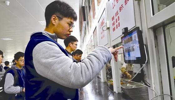 中午12点,是学生用餐时间,中学食堂供应盒饭、盖浇饭、披萨、面食等,不同年级的学生分开用餐。每层楼的食堂有十几个窗口,窗口前都放置了刷脸点餐屏幕,上面对应着饭菜的图片、名称与价格。学生们排着整齐的队伍打菜,排到的学生在屏幕前一站,人脸扫描后屏幕会显示学生的姓名、照片,学生在屏幕上选择心仪的饭菜点击,就会显示所点饭菜的价格。这时食堂的工作人员已经把配好的饭菜递了过来,整个过程快速而便捷