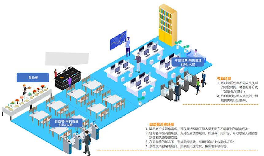人脸消费闸机主要应用于食堂的自助餐消费场景,满足客户多元化需求,灵活配置不同人员类别在不同餐别的餐费标准,针对补助型消费场景,支持配置优惠规则,如直减、打折等,可限定人员消费次数和优惠使用次数,在无网络的状态下,支持离线消费,有网后自动上传离线订单,可多维度消费报表统计,如按照门店维度、按照组织机构等。灵活设置不同人员类别的考勤时间、考勤打开方式(如刷卡/刷脸),后台也可以按照人员类别、组织机构统计出勤率。