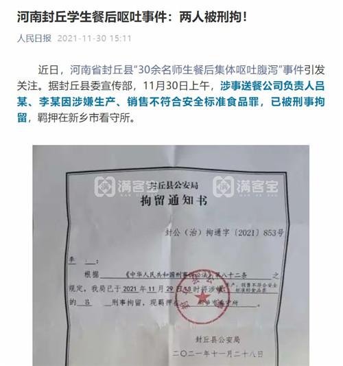 近日,河南封丘学生餐后集体呕吐、校长哭诉、送餐公司食品质量差等问题,被社会广泛关注。11月30日,人民日报发布文章,“涉事送餐公司负责人因涉嫌生产、销售不符合安全标准食品罪,已被刑事拘留。”