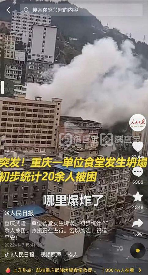 1月7日中午12时10分,重庆市武隆区食堂发生垮塌,疑似食堂燃气泄漏燃爆。据了解现场有26人被困,目前搜救出26人,其中死亡16人,其余人员正在全力救治。