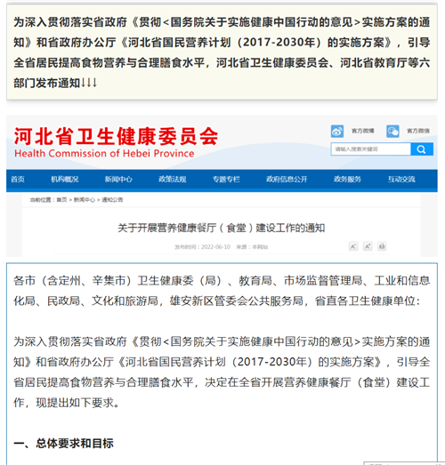 日前,河北省卫生健康委员会、河北省教育厅等六部门发布《关于开展营养健康餐厅(食堂)建设工作的通知》,通知要求,2022年各市至少要建设50家营养健康餐厅(食堂),到2025年达到每市建设不少于500家,全省不少于5000家的目标,通过示范引领,带动影响全社会形成合理膳食新风尚,推动国民营养计划和合理膳食行动向纵深发展。